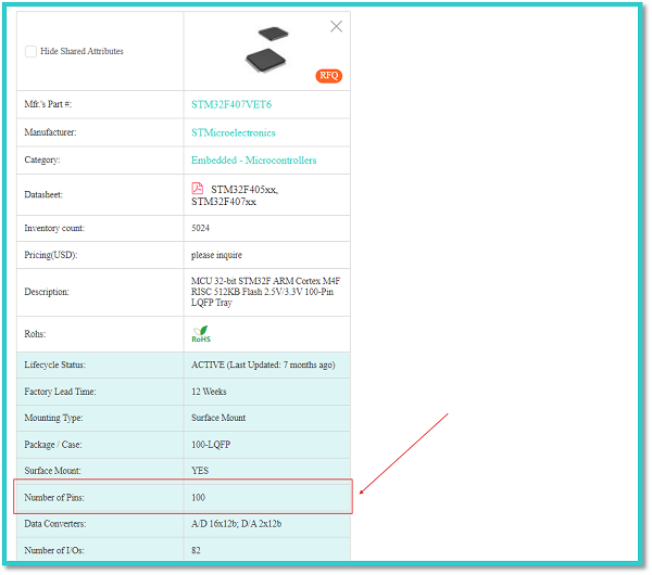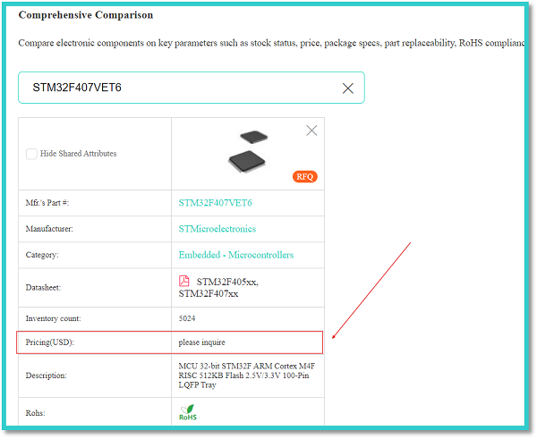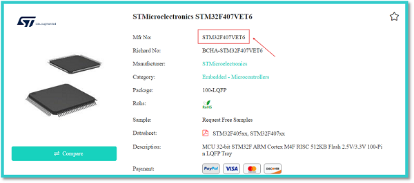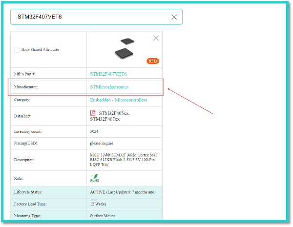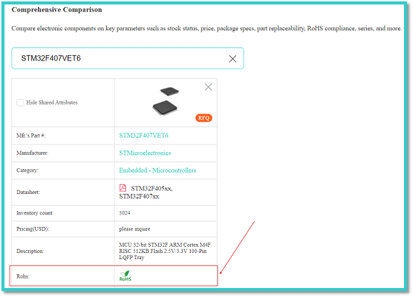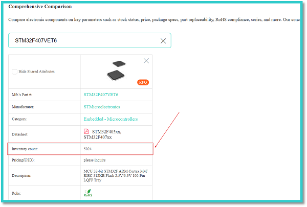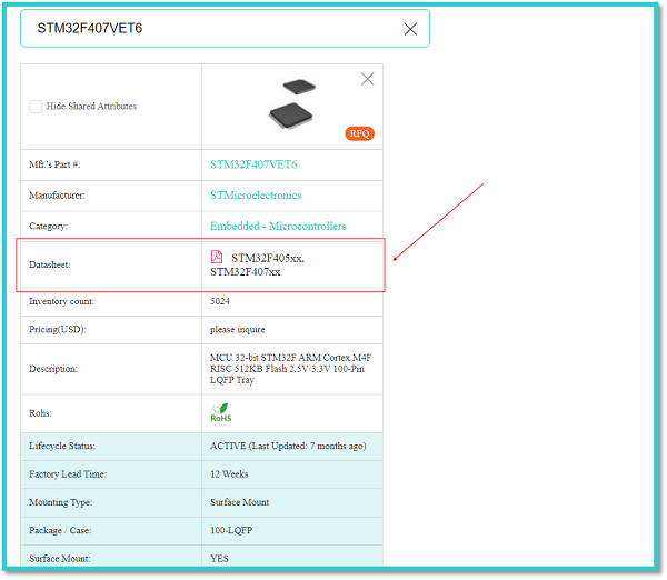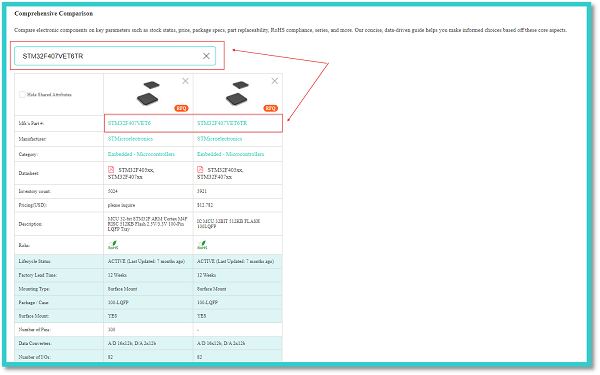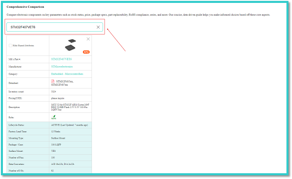 In the above figure, the red arrow indicates the manufacturer’s part number of an STMicroelectronics STM32F407VET6 integrated circuit. We can enter this manufacturer’s part number into the search bar of the comprehensive comparison tab to get all the details of the respective component.