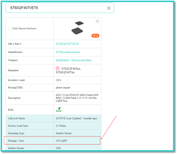 The column showing the Package or case in the list illustrates the electronic component's type packaging or cover structure. This gives a general idea about the packaging, types, and application of the material used in the electronic components. So we can assess the properties of our respective electronic components by simply looking at the package type. For example, in the case of our STMicroelectronics STM32F407VET6, the red arrow illustrates the Package/Case 100-LQFP, which is a low-profile quad flat pack for the integrated circuits. This LQFP is a thin version of QFP.